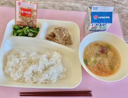 【ごはん、豚肉のしょうが焼き、さつまいものみそ汁、なのはなのおひたし、牛乳】