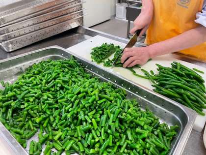 さんどまめのごまあえは、さんどまめに、ねりごま、砂糖、こいくちしょうゆで作ったタレをかけ、いりごまをふり、あえています。喫食時にかつおぶしをかけて食べます。(写真2枚目)