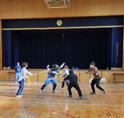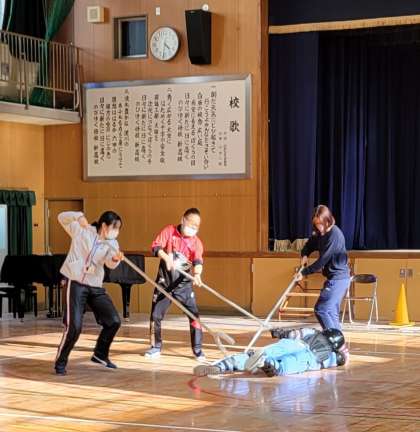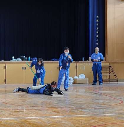 新高小学校では、淀川区役所と連携し、「セーフティーよどがわ」のみなさんを講師に迎えて今年も「さすまた研修」を行いました。