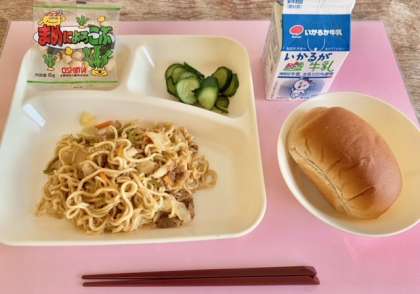 【黒糖パン1/2、焼きそば、きゅうりのしょうがづけ、豆こんぶ、牛乳】