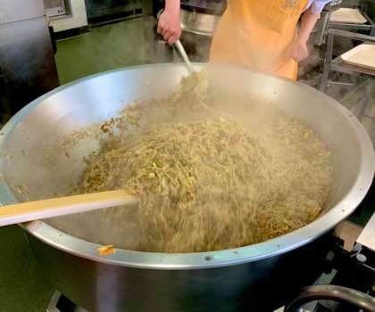 焼きそばは、豚肉を主材にしたソース味の焼きそばです。焼きそばを混ぜるのは、重くて汁気がないので、均一に混ぜるのはとても大変な作業です。上手に作るのが難しい献立のひとつで、給食調理員さんの腕の見せ所です。