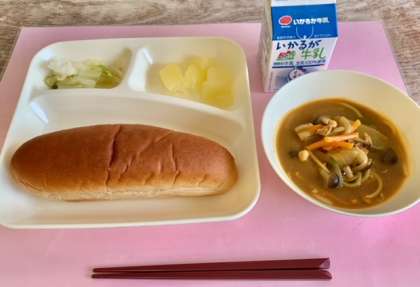 【黒糖パン、カレースープスパゲッティ、キャベツのピクルス、りんご(カット缶)、牛乳】