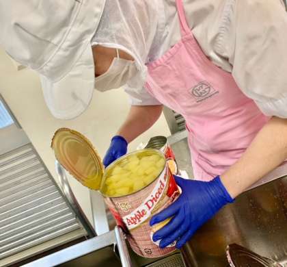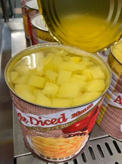 りんご(カット缶)は、国産のりんごの缶詰です。缶詰を開けた時に缶のクズなどが入ってしまっていないか、ひとつひとつ丁寧に確認しています。(写真2、3枚目)