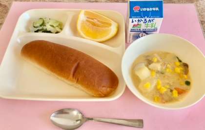 【黒糖パン、コーンクリームシチュー、キャベツときゅうりのサラダ、かわちばんかん、牛乳】