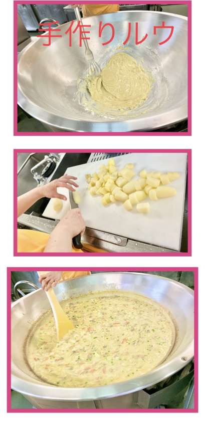 コーンクリームシチューは、鶏肉を主材に、粒状のコーンとクリーム状のスイートコーンを使い、手作りルウで仕上げたクリームシチューです。(写真1〜3枚目)
