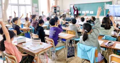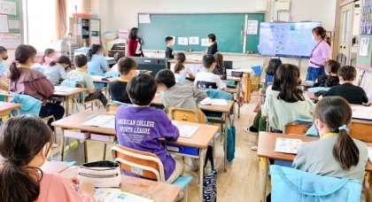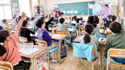 「天気」をテーマにした会話のスキルを学び、最後にその会話を、前に出た2人が発表しました。