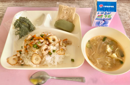 【かやくご飯、じゃがいものみそ汁、まっ茶ういろう、牛乳】