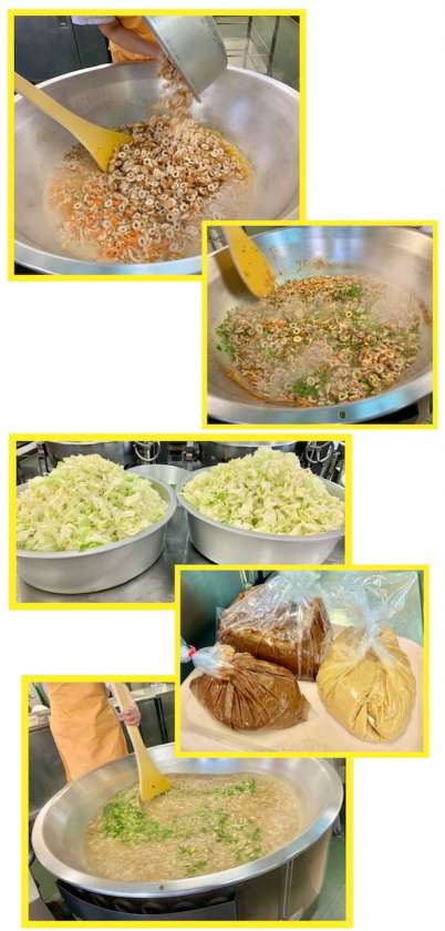じゃがいものみそ汁は、じゃがいもを主材に、キャベツ(写真4枚目)、たまねぎ、えのきたけを使い、青みに青ねぎを使用しています。給食のみそ汁は、給食調理室で、赤みそと白みそを合わせて仕上げています。(写真5、6枚目)