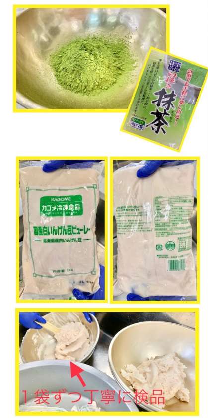 まっ茶ういろうは、新茶の季節に合わせ、抹茶(写真7、8枚目)を使ったういろうにしています。北海道産の白いんげんのペースト(写真9〜11枚目)、国産の上新粉(うるち米を粉にしたもの)、抹茶、砂糖、水を混ぜ合わせ、焼き物機で30分間蒸して作ります。喫食時にきな粉をかけていただきます。