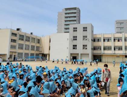 給食室からの火災を想定した避難訓練を行いました。避難経路も給食室近くを通らないようにするなどの対応でした。児童約700人ですが、スムーズに避難できました。