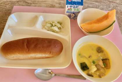 【黒糖パン、かぼちゃのクリームシチュー、キャベツのゆずドレッシング、クインシーメロン、牛乳】