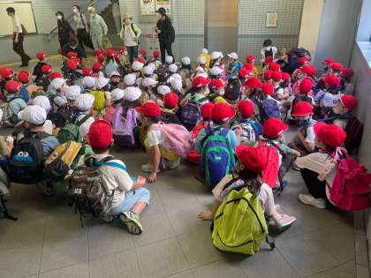 学校を出発して、まずは三国駅にぶじ到着しました。お茶をひと口飲んで、少し休憩。