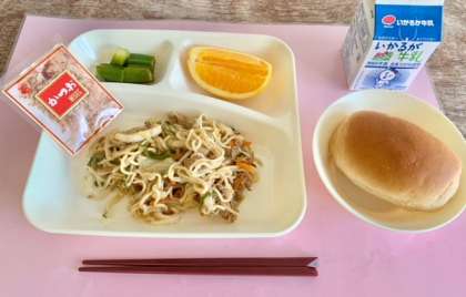 【黒糖パン1/2、和風焼きそば、オクラの甘酢あえ、オレンジ、牛乳】