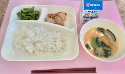 【ごはん、鶏肉のしょうゆバター焼き、とうふのみそ汁、さんどまめのごまあえ、牛乳】
