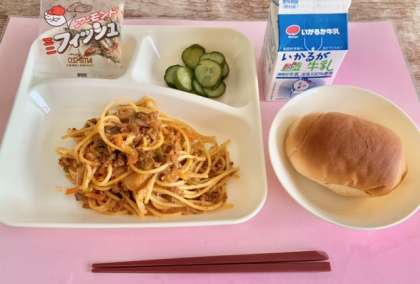 【黒糖パン1/2、スパゲッティミートソース、きゅうりのピクルス、アーモンドフィッシュ、牛乳】