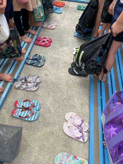 ? 小学校生活初めての水泳授業になる1年生には、気温と水温が寒くて冷たい今日の状況。これで、体調を崩したり、プールが嫌いになったりしてはいけないので、今日は実際に水に入らず着替えやプールへの歩き方、サンダルやカバンを置く位置、プールサイドでの並び