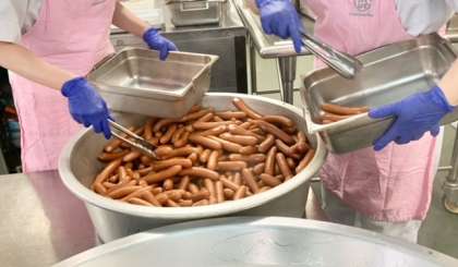 ウインナーのケチャップソースは、ウィンナーソーセージに、砂糖、ケチャップ、トンカツソース、ウスターソースを合わせて煮、でんぷんでとろみをつけたソースをかけています。(写真2枚目)