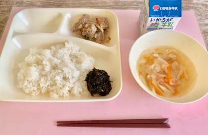 【ごはん、豚肉のごまみそ焼き、すまし汁、のりのつくだ煮、牛乳】
