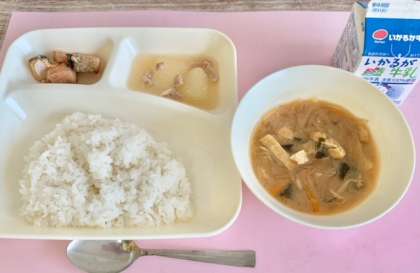 みそ汁は、じゃがいも、うすあげ、たまねぎ、にんじん、もやし、わかめを使用したみそ汁です。