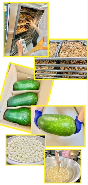 とうがんの煮ものは、夏が旬のとうがん(鹿児島県産)を固めに下ゆでしてから、しょうがの風味をきかせただしで煮ています。とうがんを味わうことができるように、鶏肉ととうがんだけの、シンプルな組み合わせにしています。(写真4〜7枚目)
