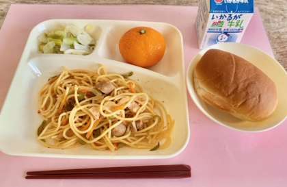 【黒糖パン1/2、チキントマトスパゲッティ、グリーンアスパラガスとキャベツのサラダ、みかん(冷)、牛乳】
