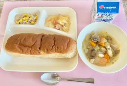 【おさつパン、鶏肉とてぼ豆のスープ煮、じゃがいもとトマトのチーズ焼き、もやしとコーンのソテー、牛乳】