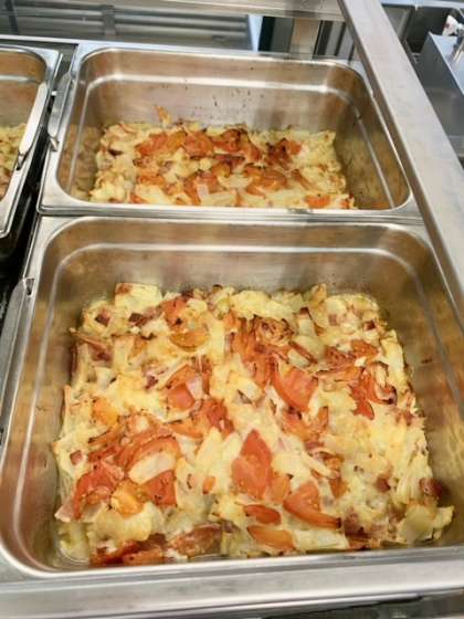 じゃがいもとトマトのチーズ焼きは、下味をつけたベーコン、じゃがいも、生のトマトにチーズをのせて、焼き物機で焼いています。子どもたちにも人気の献立で、おかわりにたくさんの手があがっていました。(写真2枚目)