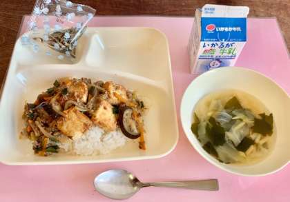 【マーボーあつあげ丼、中華スープ、ミニフィッシュ、牛乳】