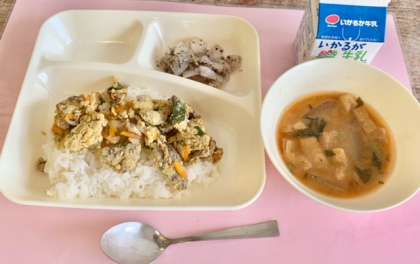 【他人丼、とうがんのみそ汁、キャベツの赤じそあえ、牛乳】