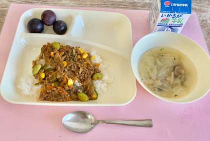 【野菜たっぷりカラフルライス、キャベツときのこのスープ、ぶどう(巨峰)、牛乳】