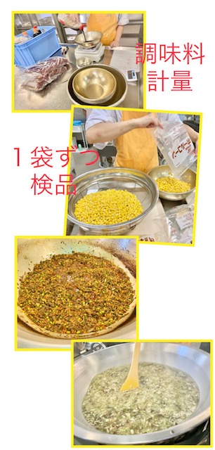 野菜たっぷりカラフルライスは、いためたにんにくとひき肉にカレー粉をふり、さらに、たまねぎ、にんじん、ピーマンをいため、塩、こしょう、ケチャップ、ウスターソースで味をつけています。最後に、えだまめ、コーンを加えたカラフルな具をごはんに乗せていただきます。(写真2〜4枚目)