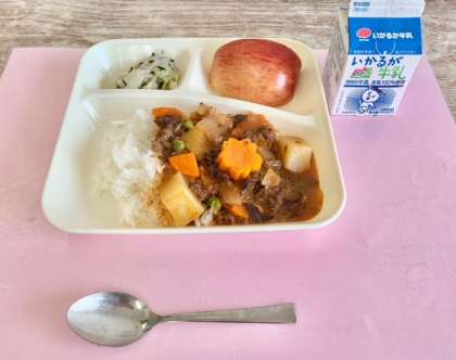 【ハヤシライス(米粉)、キャベツのひじきドレッシング、りんご、牛乳】
