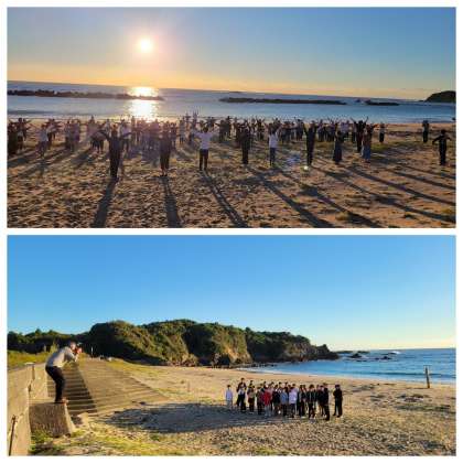 朝日を背に受けて、ラジオ体操で体を目覚めさせました。