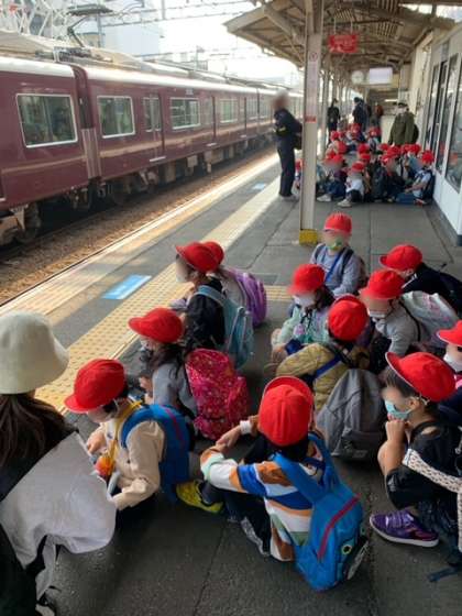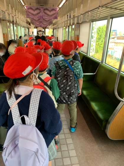 電車に乗りました。みんなワクワクで大きな声でお話ししたくなる気持ちを抑えながら、静かに過ごすことができています。
