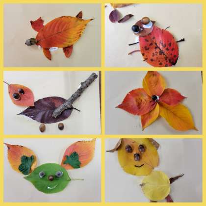 新高中央公園で集めた落ち葉や木の実を組み合わせて、いろいろなものを作ってみました。