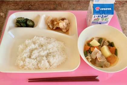 【ごはん、あげどりのねぎだれかけ、豚肉とじゃがいもの煮もの、きゅうりの赤じそあえ、牛乳】