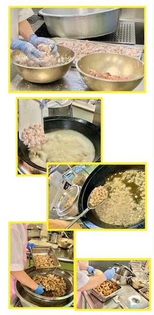 あげどりのねぎだれかけは、鶏肉に料理酒、しょうが汁で下味をつけ、でんぷんをまぶし、なたね油であげ、白ねぎ、砂糖、米酢、こいくちしょうゆ、ごま油を合わせたタレをからませています。(写真2〜6枚目)