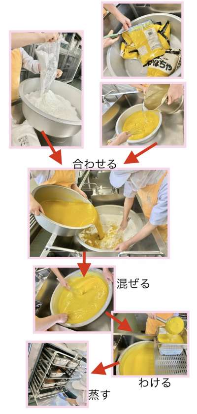 かぼちゃういろうは、かぼちゃペースト、上新粉、砂糖、水を合わせて焼き物機で蒸して作る和風デザートです。(写真2〜8枚目)