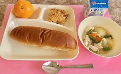 【黒糖パン、きのこのドリア、鶏肉とじゃがいものスープ煮、みかん、牛乳】