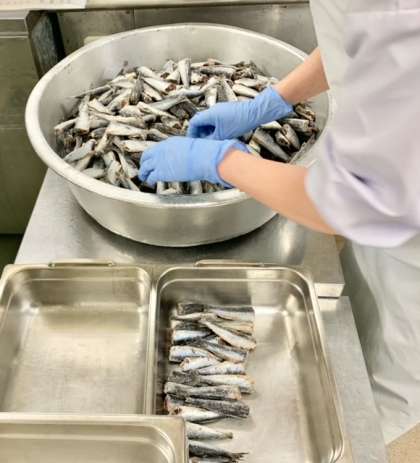 いわしのしょうが煮は、1人2尾のいわし(千葉県産)を、切りこんぶ、調味液とともにミニバットに入れ、さらにせん切りのしょうがを加え、焼き物機で煮ています。(写真2枚目)