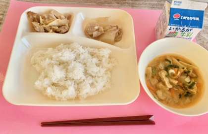 【ごはん、鶏肉の甘辛焼き、みそ汁、だいこんの煮もの、牛乳】