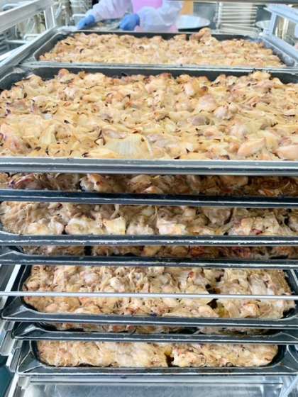 鶏肉の甘辛焼きは、鶏肉を料理酒、砂糖、みりん、こいくちしょうゆで下味をつけ、たまねぎを混ぜ合わせ、焼き物機で焼いています。(写真2枚目)