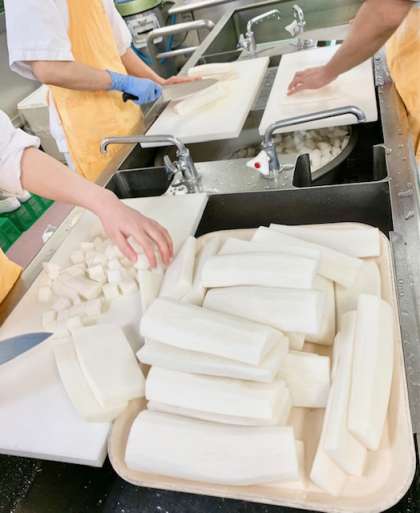 だいこんの煮ものは、冬が旬のだいこんと豚肉をだしで煮上げ、みりん、うすくちしょうゆで味つけし、水どきでんぷんでとろみをつけて仕上げています。(写真3枚目)