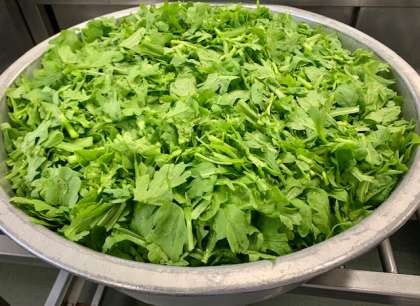 きくなとはくさいのごまあえは、旬のきくな(写真3枚目)とはくさいを合わせて使用し、食べやすくしています。砂糖、うすくちしょうゆで作ったタレをかけ、いりごまをふり、あえています。