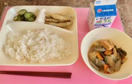 【ごはん、きびなごてんぷら、あつあげと野菜の煮もの、きゅうりの甘酢づけ、牛乳】
