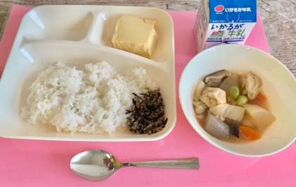 【ごはん、卵どうふ、一口がんもと野菜の煮もの、魚ひじきそぼろ、牛乳】