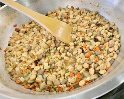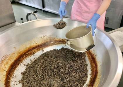 魚ひじきそぼろは、魚ミンチをいため、料理酒をかけ、ひじきを加えていため、甘辛く味つけし、しそを加えて風味を増しています。ごはんに添えていただきます。(写真3枚目)