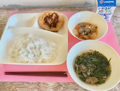 【ごはん、鶏肉の土手焼き風、はりはり汁、れんこんのフライ大阪ソース味、牛乳】