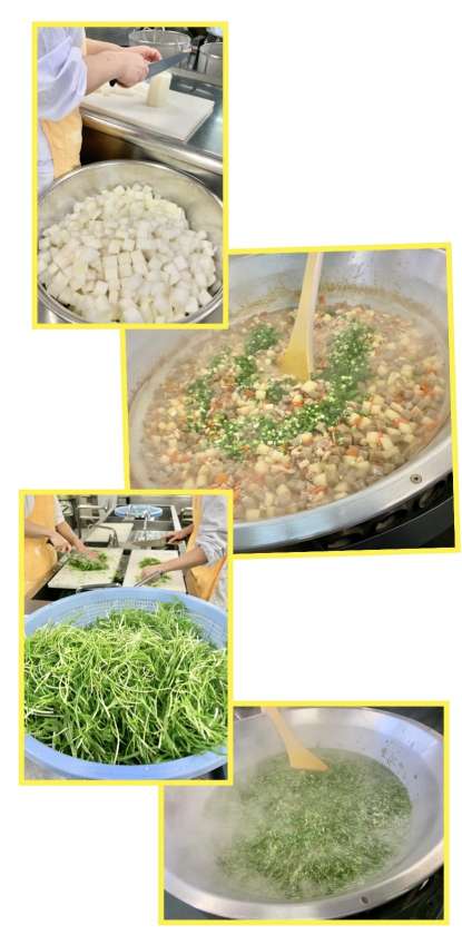 鶏肉の土手焼き風は、鶏肉、こんにゃく、だいこん、にんじん、青みに青ねぎを使用し、砂糖、みりん、料理酒、赤みそ、白みそで味つけして、みそがこげつかないようにじっくりと煮込んでいます。(写真2、3枚目)