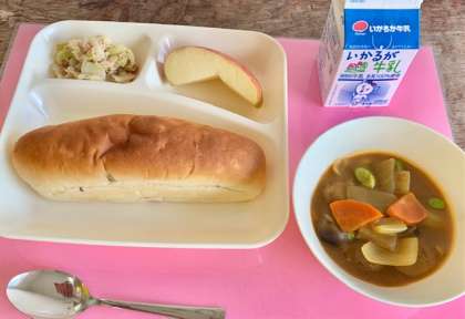 【おさつパン、ミートボールと野菜のカレー煮、ツナとキャベツのソテー、りんご、牛乳】